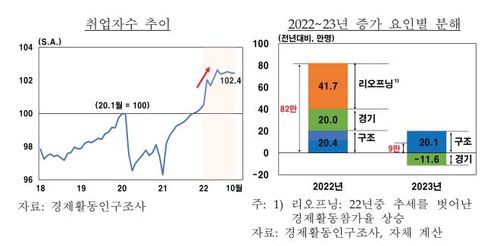 한은은 내년에는 리오프닝 효과가 사라지는 데다 경기 둔화 영황이 본격화하면서 취업자수 증가 폭이 9만명으로 축소될 것으로 내다봤다.