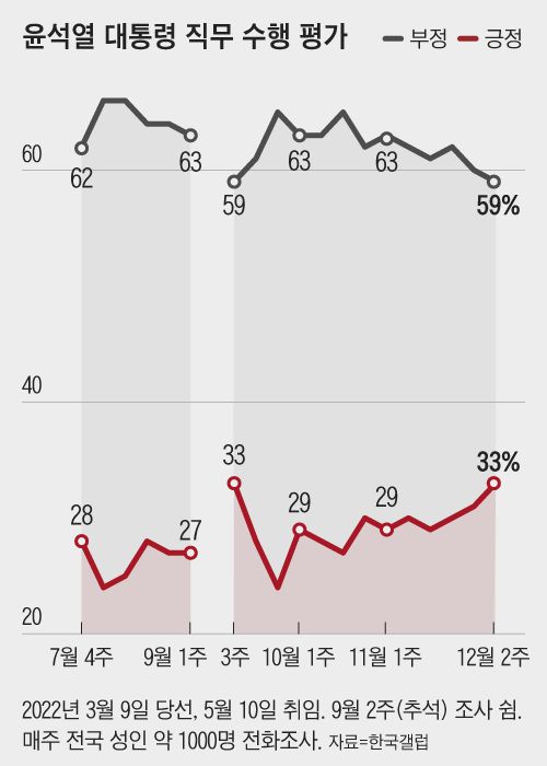 윤석열 대통령의 국정 수행에 대한 긍정평가는 33%, 부정평가는 59%로 각각 나타났다. 그 외는 의견을 유보했다(어느 쪽도 아님 3%, 모름/응답거절 5%). 긍정평가는 전주 대비 2%p 상승, 부정평가는 1%p 하락한 수치다.