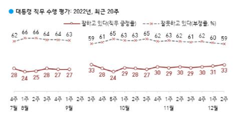 윤 대통령의 직무 수행을 부정평가한 응답은 59%를 기록했다. 전주보다 1%포인트 하락하며 지난 9월 넷째주 61%로 올라 선 이후 11주 만에 60%대 아래로 떨어졌다.