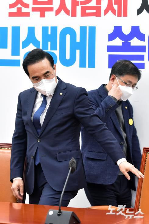 더불어민주당 박홍근 원내대표가 9일 서울 여의도 국회에서 내년도 예산안 협상 관련 기자간담회에 참석하고 있다.