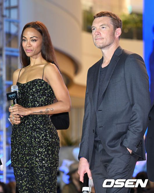 [OSEN=이대선 기자] 9일 오후 서울 영등포 타임스퀘어에서 영화 '아바타2: 물의 길' 블루카펫 행사가 진행됐다. 배우 조 샐다나와 샘 워싱턴이 팬들에게 인사를 하고 있다. 2022.12.09 /sunday@osen.co.kr