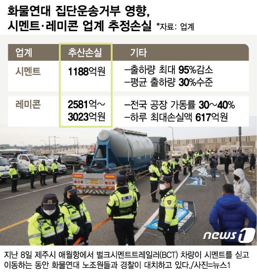 [머니투데이 이재윤 기자] [화물연대 집단운송거부 16일 만에 백기…시멘트 1188억, 레미콘 3020억원 피해추산]