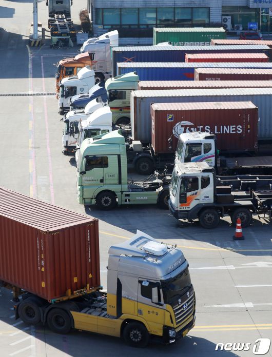 (의왕=뉴스1) 민경석 기자 = 민주노총 공공운수노조 화물연대본부(화물연대)가 총파업을 철회한지 사흘째를 맞는 11일 경기 의왕시 내륙컨테이너기지(ICD)에서 화물차량이 운행에 나서고 있다. 화물연대가 파업을 종료하면서 물류가 빠르게 회복되고 있는 것으로 나타났다. 이날 철강업계에 따르면 철강업체가 몰려 있는 경북 포항시의 화물 물동량이 파업 전 대비 70~80%, 구미지역은 90% 수준까지 회복된 것으로 예상된다. 화물연대는 지난 9일 총파업 종료 찬반투표를 진행, 과반이 찬성해 파업을 종료하고 현장에 복귀했다. 2022.12.11/뉴스1