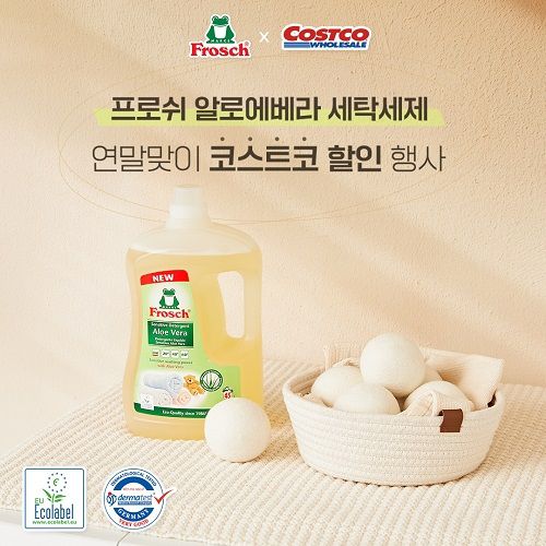 코스트코의 프로쉬 알로에베라 세탁세제는 3L 용량, 2개 세트 6L의 대용량 구성으로 용량 대비 합리적인 가격으로 만날 수 있다. 유럽 친환경 인증 EU 에코라벨과 피부 저자극 인증 더마테스트 엑설런트 등급을 받았다.