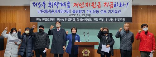 (전주=연합뉴스) 김동철 기자 = 전국농민회총연맹 전북도연맹 등 전북 3개 농민단체와 진보당 전북도당이 "전북도와 지자체들은 남은 예산(순세계잉여금)을 활용해 저소득 취약계층에 대한 재난지원금을 편성하라"고 촉구했다.