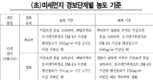 앞서 서울시는 이날 오전 4시 기준 미세먼지(PM-10)의 시간당 평균 농도가 150㎍/㎥ 이상으로 2시간 지속되면 주의보가 발령했다. 또 오전 10시 기준 미세먼지(PM-10)가 시간당 평균 농도 300㎍/㎥ 이상으로 2시간 지속돼 ‘미세먼지(PM-10) 경보’를 발령했다. 이어 오후 5시 평균 농도가 150㎍/㎥ 미만으로 내려와 다시 주의보로 전환한 바 있다.