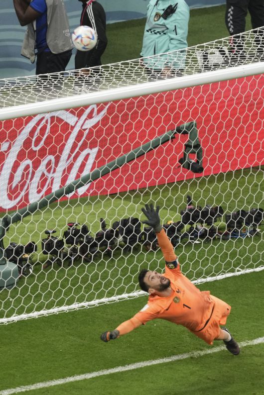 프랑스의 골키퍼 위고 요리스가 지난 10일(현지시간) 2022 카타르월드컵 8강전에서 잉글랜드의 골잡이 해리 케인의 페널티킥을 막으려 몸을 던지고 있다. 케인의 슛은 불발됐다. 알코르|신화 연합뉴스 |