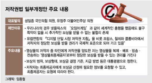 성일종 국민의힘 의원, 유정주 더불어민주당 의원이 각각 대표발의한 저작권법 개정안은 연출·각본 등 영상물의 창작자가 제작사 등 타인에게 IP(지식재산권)를 양도하더라도 방송·극장·OTT 등 콘텐츠 유통 플랫폼(최종제공자)으로부터 발생한 수익에 대한 보상청구권을 갖는 내용이다.