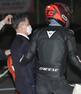화천대유 대주주 김만배 씨(왼쪽)가 2021년 10월 15일 1차 구속영장이 기각돼 풀려나자, 오토바이를 타고 헬멧쓴 채 서울구치소로 마중나온 전 쌍방울그룹 부회장 최우향 씨. 뉴스1 |