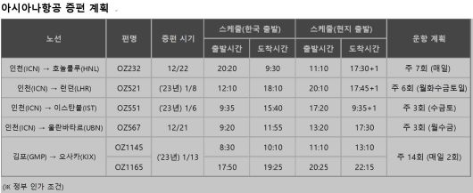 아시아나항공 관계자는 “겨울 성수기를 맞아 여행수요 증가에 대비해 공급을 확대했다”며 “내년 여름 시즌에도 지속적인 증편을 통해 이용객들의 편의를 높일 계획”이라고 말했다.