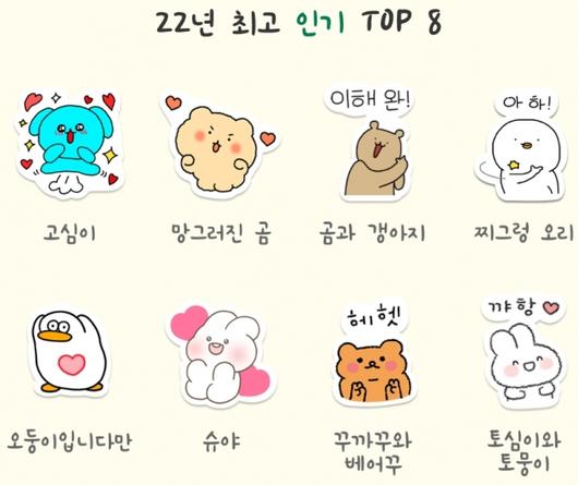 카카오는 올 한해 이용자들의 마음을 사로잡은 이모티콘 8종도 공개했다. '망그러진 곰', '곰과 갱아지', '찌그렁 오리', '오둥이입니다만', '슈야', '꾸까꾸와 베어꾸', '토심이와 토뭉이' 등 다양한 동물 이모티콘들이 사랑을 받았다. SNS와 팝업 스토어에서 인기를 끌었던 '고심이'도 순위권에 올랐다.