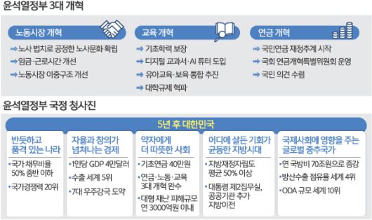 교육개혁과 관련해서는 이주호 사회부총리가 “획일적인 평등 이념에 갇힐 경우 대한민국의 미래는 어두울 것”이라면서 로드맵을 발표했다. 로드맵은 아이들의 기본 인권인 기초학력을 갖추는 데 정책의 주안점을 두겠다는 내용이 담겼다. 이 부총리는 디지털 디바이스와 인공지능(AI)을 수업에 적극 활용하고, 교사들도 새로운 시대에 맞게 전문성을 갖출 수 있도록 교원양성기관을 혁신하겠다고 약속했다. 그러면서 “다양한 방과 후 프로그램과 돌봄서비스를 갖추어 유보통합도 완수하겠다”고 덧붙였다.