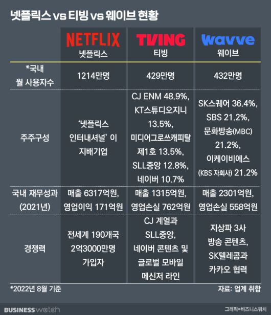 티빙도 마찬가지다. CJ 계열 콘텐츠 사업자들의 이익뿐 아니다. 티빙 지분 13.5%를 KT스튜디오지니가 보유하고 있는데, 이런 '동맹' 콘텐츠 사업자들은 '이상한 변호사 우영우'를 티빙에서만 유통하고 싶지 않을 것이란 지적이다. 이들 국내 OTT 사업자는 넷플릭스가 경쟁사이면서 동시에 고객사인 딜레마를 안고 있다는 분석이다.