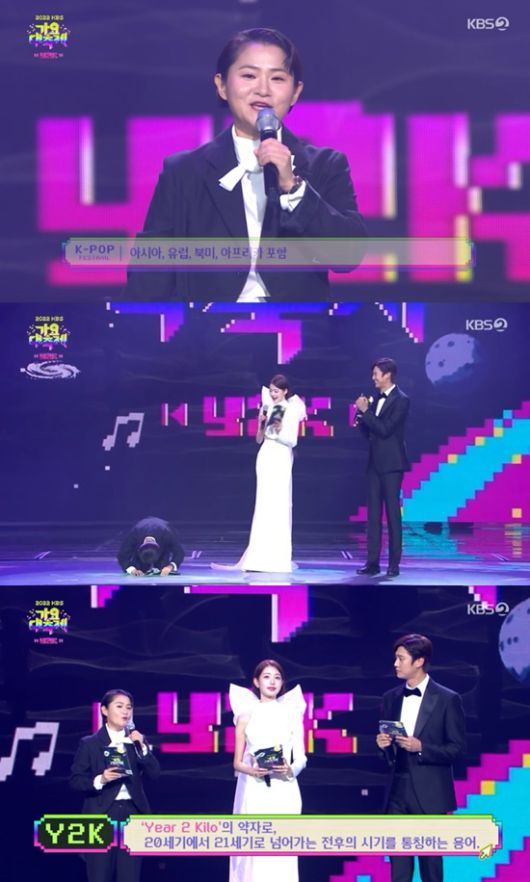 Y2K에 걸맞게 '가요대축제'는 코요태의 '순정'으로 시작했다. 코요태는 전 출연진들과 함께 무대에 올라 세대 통합일 이뤘다. 김신영은 "24년 전 발매된 곡이다. 이렇게 모두가 하나가 될 수 있는 멋진 음악의 힘 아닌가 싶다"고 설명했다.