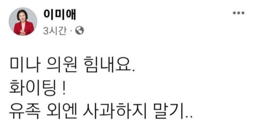 이 의원은 지난 16일 자신의 페이스북에 “미나 의원 힘내요. 화이팅! 유족 외엔 사과하지 말기”라는 글을 올렸다. 이 의원은 이후 논란이 일자 해당 글을 삭제했다.