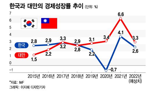 올해 IMF가 전망한 대만 경제 성장률도 3.3%로 지난해보다 차이는 줄었지만, 여전히 한국(2.6%)보다 높다.