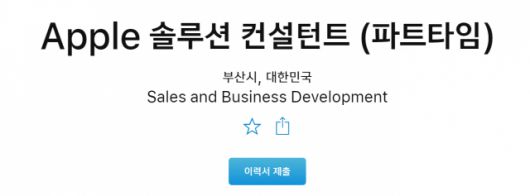 18일 업계에 따르면 애플은 지난 7일부터 공식 홈페이지에서 부산에서 근무할 애플 솔루션 컨설턴트(ASC)를 모집 중입니다. ASC는 애플 샵의 판매, 매장운영, 직원 교육 등을 관리한다고 합니다. 애플은 “매장에서 애플을 대표하는 직원으로서 애플샵의 역량을 강화한다”며 고객 응대, 판매 직원을 위한 코칭, 매니저와 매장 운영 협의 등을 주요 업무로 설명하고 있습니다. 기존 대행 판매 매장 관리가 아닌 애플스토어 운영을 위한 직책으로 보입니다.