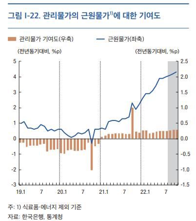 관리물가가 근원물가를 낮추는 역할을 하는 대신 상승에 기여하는 정도가 커지고 있는 셈이다.