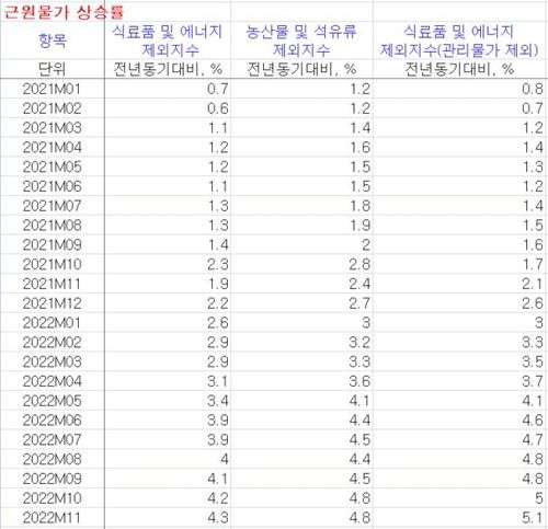 관리물가 제외 식료품 및 에너지 제외지수 상승률은 6월 4.6%에서 7월 4.7%, 8월과 9월 각 4.8%에서 이어 10월 5%, 11월 5.1%까지 높아졌다.