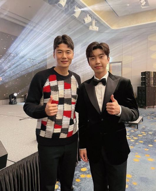 공개된 사진에는 근사한 턱시도 차림의 임영웅과 캐주얼한 스웨터를 입은 기성용이 카메라를 향해 포즈를 취하고 있다. 두 사람의 훈훈한 비주얼이 주변을 밝힌다.