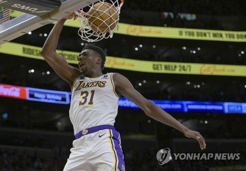 (서울=연합뉴스) 김동찬 기자 = 미국프로농구(NBA) LA 레이커스가 토머스 브라이언트의 결승 덩크슛으로 워싱턴 위저즈에 2점 차 승리를 거뒀다.