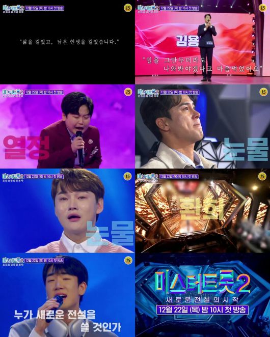 지난 16일 공개된 TV조선 트로트 오디션 '미스터트롯2-새로운 전설의 시작'(이하 '미스터트롯2') 1회 예고편에서는 '트롯에 살고 트롯에 죽는' 열혈 사나이들의 열띤 경연 스토리와 그들의 희로애락을 고스란히 느끼며 울고 웃는 마스터 군단의 모습이 담겼다.