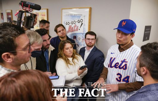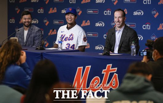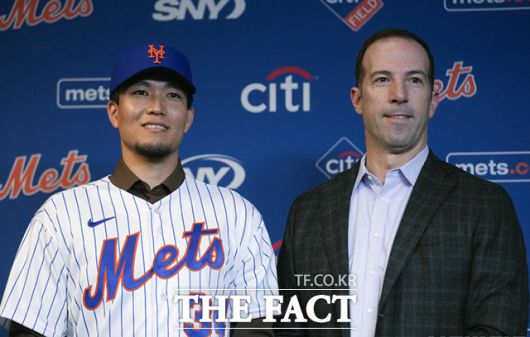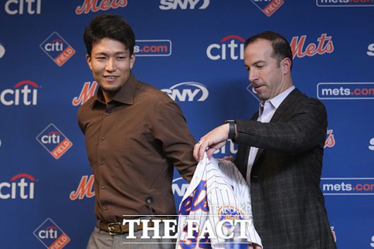 [더팩트ㅣ남용희 기자] 센가 코다이(왼쪽)가 19일(현지시간) 미국 뉴욕 시티필드에서 열린 뉴욕 메츠 입단 기자회견에서 빌리 에플러 뉴욕 메츠 단장의 도움으로 유니폼을 입고 있다.