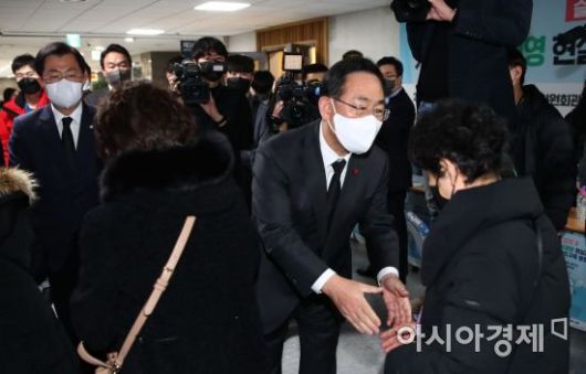 주호영 국민의힘 원내대표가 20일 국회에서 이태원 참사 희생자 유가족들과 간담회를 갖기에 앞서 인사를 나누고 있다./윤동주 기자 doso7@ |