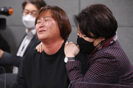 조은희 국민의힘 의원(오른쪽)이 20일 서울 여의도 국회 의원회관에서 열린 국민의힘과의 간담회에서 눈물을 흘리는 유가족을 위로하고 있다. 공동취재 |