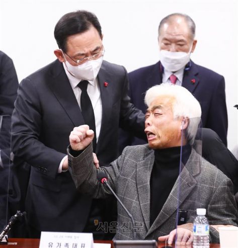 주호영(왼쪽) 국민의힘 원내대표가 20일 국회에서 열린 이태원 참사 유가족협의회 간담회에서 배우 고 이지한씨의 부친인 이종철 유가족협의회 대표를 위로하고 있다. 국민의힘은 간담회 직후 유가족들의 요구를 수용해 21일부터 특위에 복귀하기로 했다.오장환 기자 |