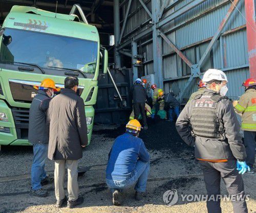 사고는 석탄이 실린 28t 트럭 적재함이 옆으로 넘어지면서 인근에서 하역 작업 중이던 A씨를 덮치며 발생한 것으로 알려졌다.