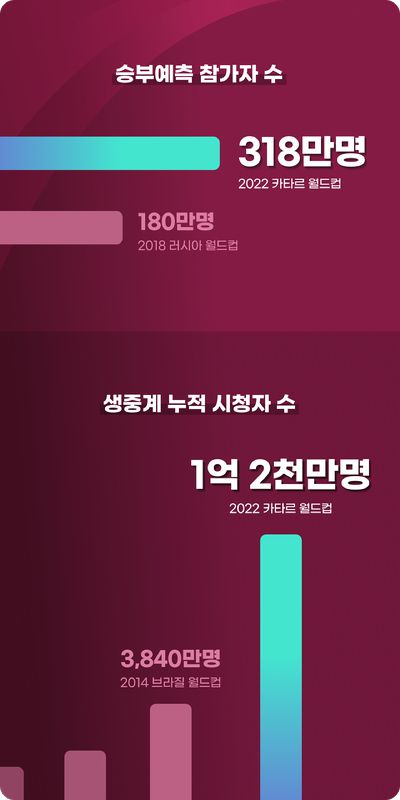 조별리그 경기 승패를 모두 맞춘 이용자가 나오지 않아 세 차례 이월됐던 참여형 이벤트 '월드컵 승부예측'은 총 7회차 누적 318만4천288명이 참가, 2018년 러시아 월드컵(180만명)을 훌쩍 뛰어넘은 것으로 나타났다.