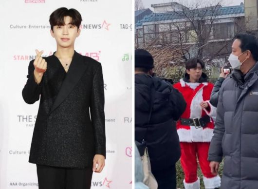지난 13일 일본에서 열린 '2022 아시아 아티스트 어워즈'에 참석했던 임영웅 모습(왼쪽)과 21일 서울 마포구 홍익대 인근에서 산타 복장을 한 채 팬들과 만나는 임영웅의 모습. /사진=이동훈 기자, 트위터 캡처 |
