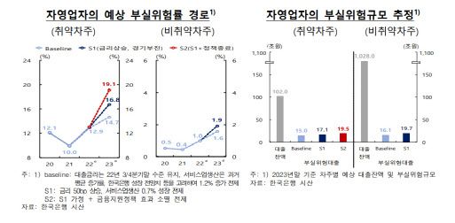 문제는 대출금리 상승세가 이어지고 매출 회복세가 둔화하는 가운데 금융지원정책 효과가 사라질 경우 취약차주를 중심으로 부실위험률이 높아질 가능성이 크단 점이다. 경기, 금리 및 정책효과에 영향을 받는 자영업자 부실위험률 모형을 통해 시나리오별 부실위험률 변화를 시산한 결과 부실위험률은 확대되는 것으로 나타났다.