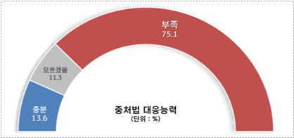 또 기업 10곳 중 1곳만(13.6%)이 중처법 의무에 대한 대응능력이 충분하다고 답변했다. 대응능력이 부족하거나 모르겠다고 답한 기업들도 86.4%를 차지했다.