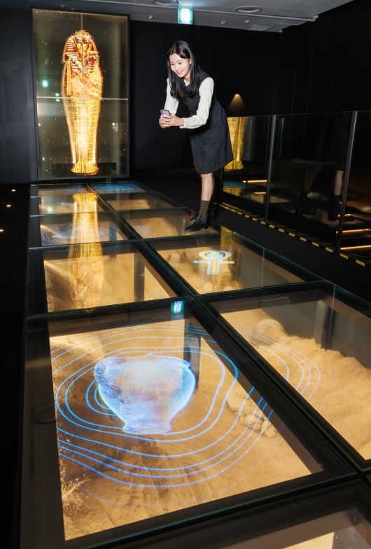 (서울=뉴스1) 노우리 기자 = 색이 바랜 고대 이집트 벽화 위로 미닫이문처럼 생긴 투명한 유리창이 지나가자 화려한 색조, 상형문자의 뜻이 아로새겨졌다. 여기저기서 탄성이 나오는 순간, 발을 딛고 있던 바닥이 삽시간에 투명하게 변하며 모래 속에 파묻혀 있던 유물들의 모습이 드러났다. 그야말로 ‘유리창의 화려한 변신’이었다.