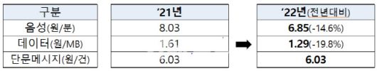 우선 이동통신 시장지배적 사업자로서 알뜰폰 도매제공 의무가 있는 SK텔레콤은 데이터와 음성 도매대가를 각각 19.8%, 14.6% 인하하기로 했다. 이에 따라 1MB당 데이터 요금은 1.29원으로 1분당 음성 요금은 6.85원으로 내려간다.