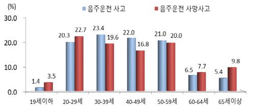 음주운전 교통사고를 가장 많이 내는 운전자는 30대로 집계됐다. 음주운전으로 인한 사망사고를 가장 많이 내는 운전자의 연령은 20대였다. 전체 교통사고를 발생시키는 연령대가 일반적으로 40~50대인 것과는 상반되는 부분이다.
