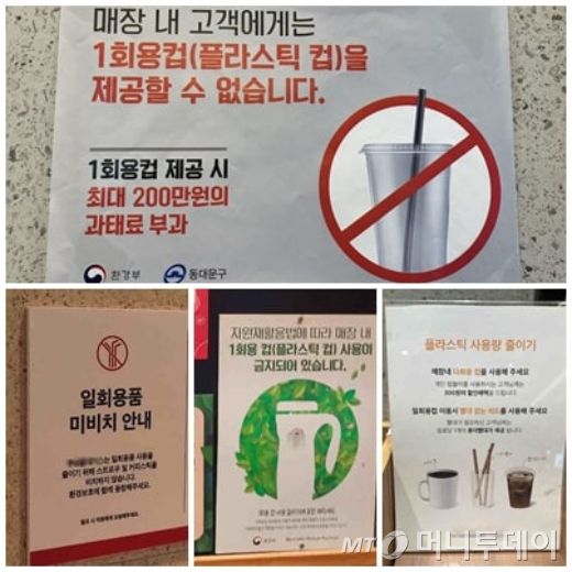 21일 오후 서울 동대문구의 한 프렌차이즈 커피숍 한쪽 벽면에 이같은 문구가 쓰여있었다. 지난달 24일부터 시행된 일회용품 사용규제를 알리는 문구다. 하지만 매장 내에서 음료를 마시는 사람들은 플라스틱컵과 종이컵을 쓰고 있었다. 자원재활용법에 따르면 카페 내 일회용 컵, 종이컵, 플라스틱 빨대는 모두 사용 금지 대상이다.