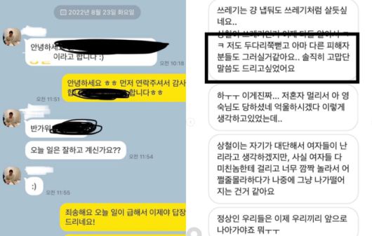 그러면서 그는 "영숙님은 저에게 지속적으로 사과문을 강요하며, 만약 사과문을 올리지 않으면 저에 대한 폭로(그 내용은 알 수 없지만)를 계속 이어갈 수밖에 없다고 협박 했다. 저는 일을 키우기 싫어 어쩔수 없이 영숙님과 협의한 사과문 내용을 유튜브 채널에 그대로 올리는 조건으로 영숙님께 전달했다. 하지만 이 마저도 영숙님이 저의 허락없이 마음대로 사과문을 재편집하여 저의 의사와는 전혀 관련 없는 사과문을 유투브에 게시하도록 만들었다. 저는 해당 유튜브채널에 연락하여 저의 의사와는 다른 사과문이므로 즉시 해당 게시물을 삭제해달라고 요구까지 하는 상황이 벌어졌다"고 억울함을 호소했다.