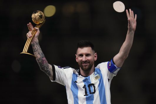 지난 18일(현지시간) 카타르 루사일 스타디움에서 열린 아르헨티나와 프랑스의 월드컵 결승전 직후 우승한 아르헨티나 축구 국가대표팀의 주장인 리오넬 메시(35·파리 생제르맹)가 최우수 선수에게 주어지는 ‘골든볼’을 들어올려 팬들에게 화답하고 있다. 루사일=AP연합 |