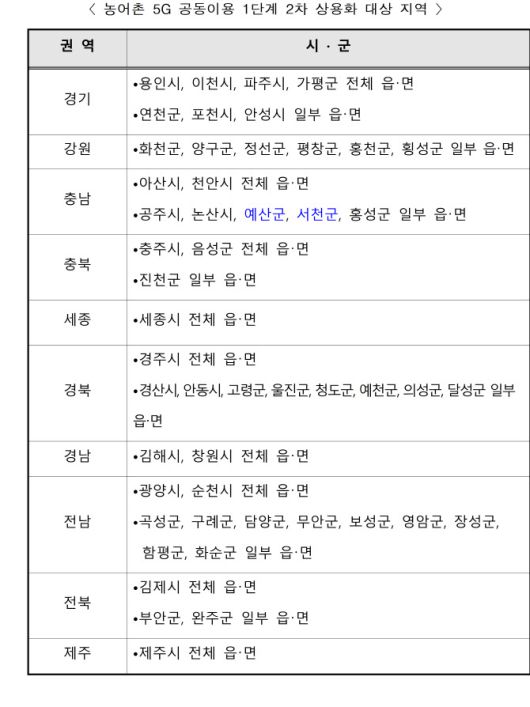 통신 3사는「농어촌 5G 공동이용 계획」(‘21.4월 발표)에 따라 131개 시·군에 소재한 읍·면 지역을 대상으로 ’24년 상반기까지 단계적으로 상용화 완료할 계획이다.