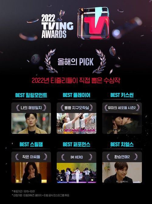 ‘2022 티빙어워즈’의 일환으로 마련된 ‘올해의 PICK’ 이벤트는 이용자들이 가장 재미있게 본 콘텐츠에 투표하는 방식으로 진행됐으며, 지난 15일부터 일주일간 약 95만표가 모여 치열한 접전을 펼쳤다. 이를 통해 ▲베스트 치얼스 ▲베스트 키스씬 ▲베스트 퍼포먼스 ▲베스트 플레이어 ▲베스트 힐링모먼트 ▲베스트 스릴잼 부문에서 올해를 빛낸 콘텐츠 6편이 선정됐다.