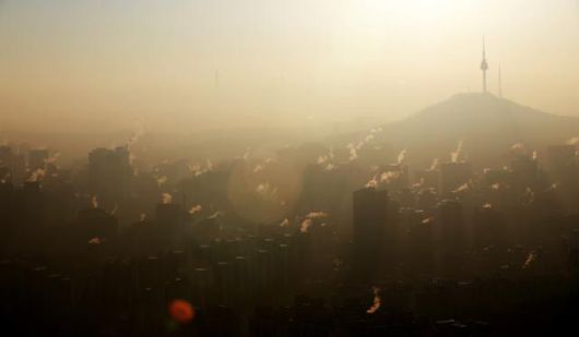 중부지방 초미세먼지 농도가 나쁨 수준을 보인 27일 오전 서울 시내 건물에서 난방 수증기가 나오고 있다. 뉴스1 |