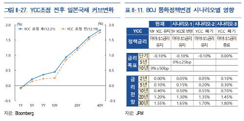 일본은행은 “YCC 조정이 통화정책의 효과를 제고하기 위한 조치”라면서 본격적인 통화긴축 전환을 의미하는 것이 아니란 입장을 보이고 있지만, 시장 참가자들은 이를 시작으로 일본은행이 내년 추가 정책 조정을 통해 완화적 통화정책 기조를 점차 철회할 것이라고 예상하고 있다.