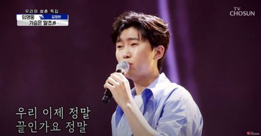 영상에는 임영웅이 TV조선 ‘사랑의 콜센타’에서 선보인 나예원의 ’가슴은 알죠’ 무대가 담겼다. 특히 임영웅은 애절한 목소리로 노래를 부르며 시선을 사로잡는다.