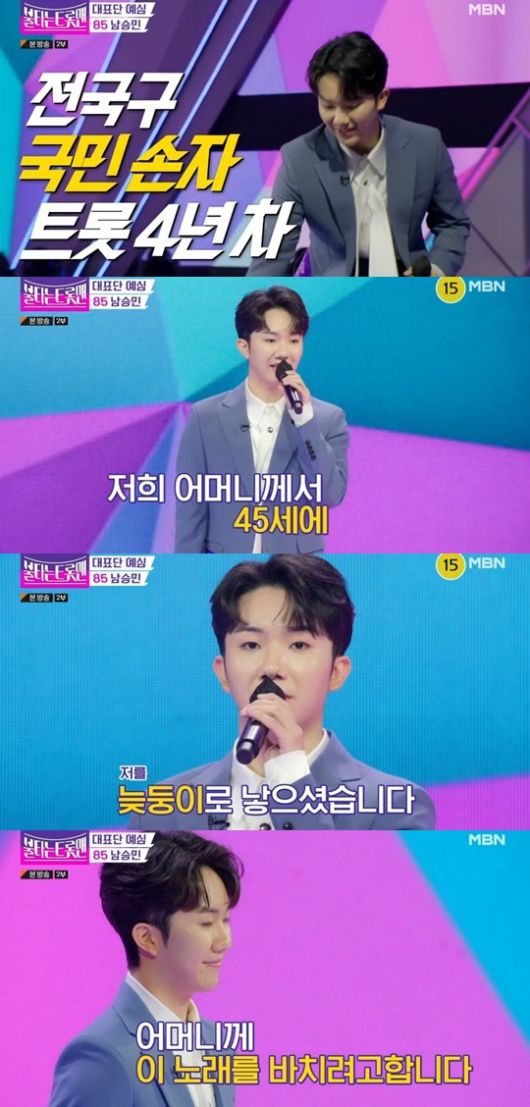 남승민은 "국민 손자에서 이제는 국민 아들이 되고 싶은 스무 살 남승민입니다" 라고 말했다. 그는 경연곡으로 안성훈의 '엄마꽃' 을 선곡했다. MC 김성주가 선곡의 이유를 묻자 남승민은 "저희 엄마가 45세에 저를 늦둥이로 낳으셨다" 며 "저희 어머니의 인생을 잘 그려낸 노래인 것 같다, 어머니께 노래를 바치고 싶다" 고 곡 선택의 이유를 밝혔다.