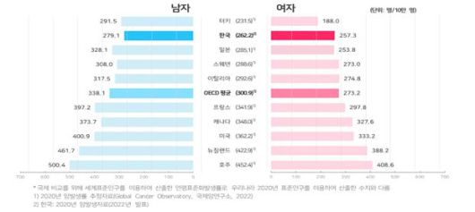 세계표준인구로 보정한 한국 암 발생률은 인구 10만명당 262.2명으로 경제협력개발기구(OECD) 평균(300.9명) 및 미국(362.2명), 프랑스(341.9명), 캐나다(348.0명), 이탈리아(292.6명) 등보다 낮은 수준이다.