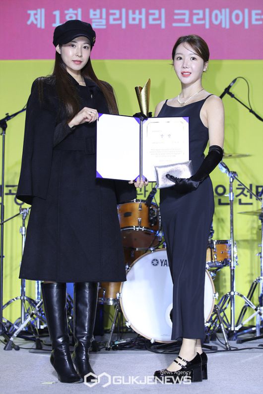 (인천=국제뉴스) 이대웅 기자 = '2022 제 1회 빌리버리 크리에이터 어워즈'가 지난 4일 인천 송도 컨벤시아 1홀에서 열렸다. 이날 모델 쇼호스트상을 수상한 모델 겸 쇼호스트 김리하가 쏭바디핏 이송이 대표와 함께 기념 포즈를 취하고 있다.
