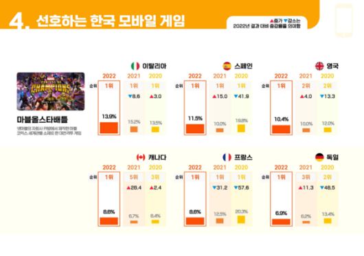 더불어 모바일 게임은 넷마블 자회사 카밤의 마블 올스타 배틀이 가장 많은 국가들의 선택을 받았다. 마블 올스타 배틀은 이탈리아 스페인 영국 캐나다 프랑스 독일에서 가장 선호하는 한국 모바일 게임으로 뽑혔다. 마블 올스타 배틀 역시 지난 2014년 출시돼 10주년을 향해 달려가고 있는 게임이다. 또 중국에선 넥슨의 카트라이더 러쉬플러스가 가장 선호하는 한국 게임으로 뽑였다. 일본 애니메이션 지식재산권(IP)을 활용한 게임 넷마블의 '일곱개의 대죄'는 일본 게이머들이 가장 선호하는 한국 모바일 게임 자리를 탈환했다.